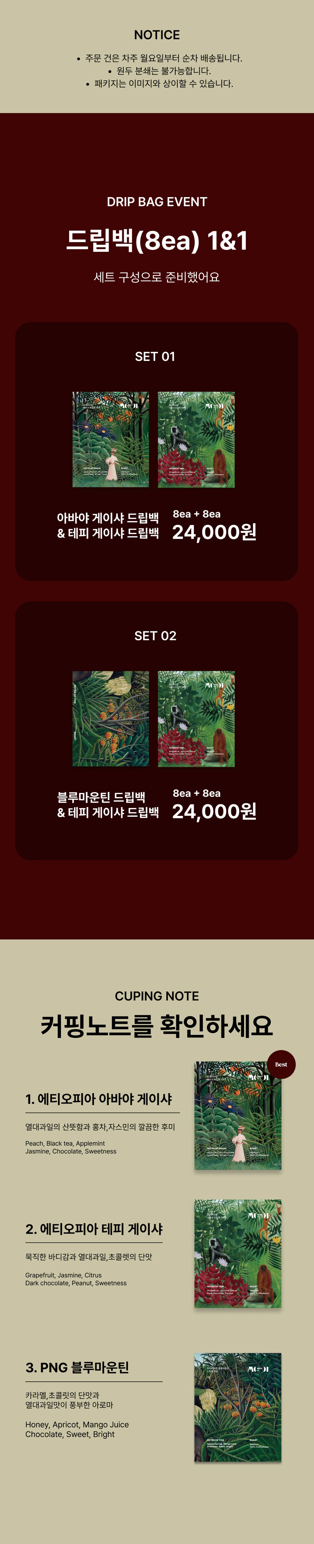 - 원두 상품의 경우 주문 접수 후 제조되는 상품으로 오주문 혹은 단순 변심으로 인한 교환∙반품이 불가능합니다.