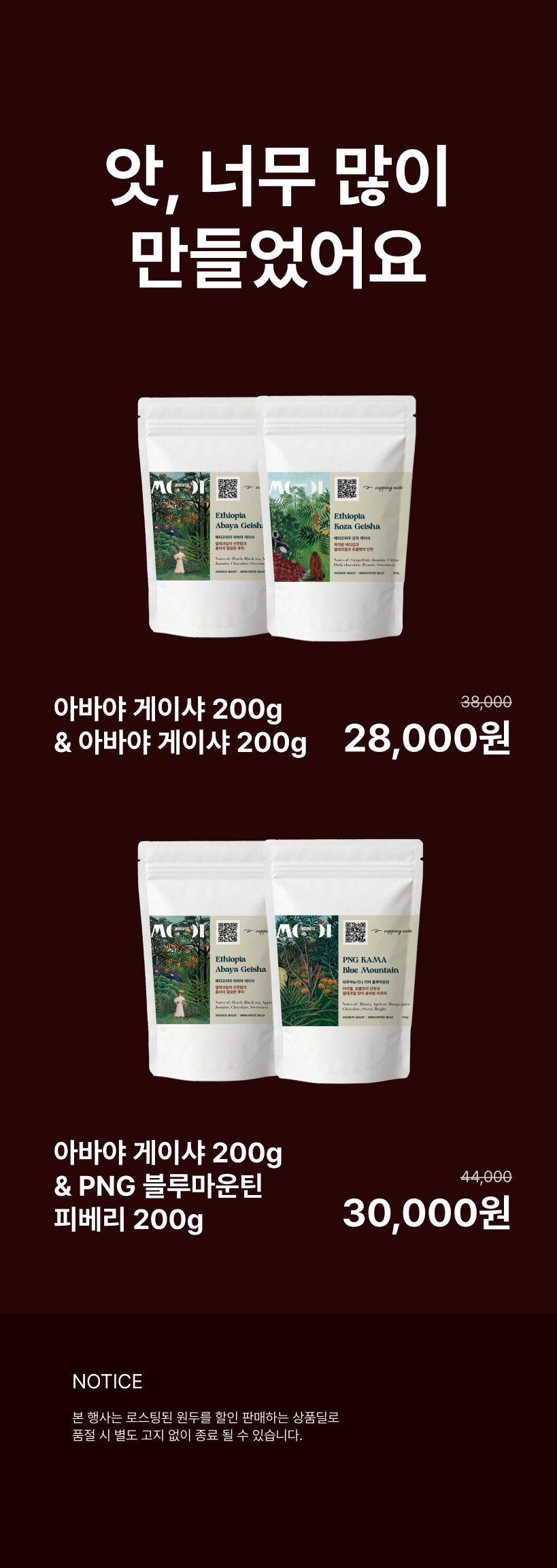 - 본 행사는 로스팅된 원두를 할인 하는 상품딜로 품절 시 별도 고지 없이 종료 될 수 있습니다.